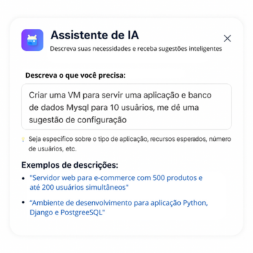 Informe o tipo de aplicação (site, banco de dados, sistema) e a IA recomenda CPU, RAM e disco ideais para sua VM. Ganhe performance e confiança sem tentativa e erro.